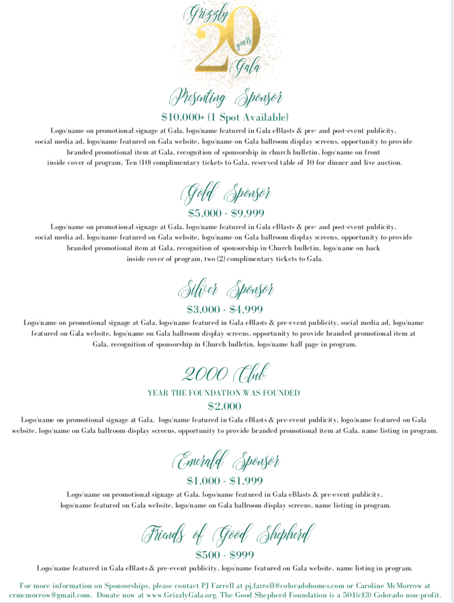 Each Sponsorship level offers various benefits, such as entrance tickets to Gala or recognition on signage.  Review the different levels and benefits by clicking on SPONSOR PERKS.
